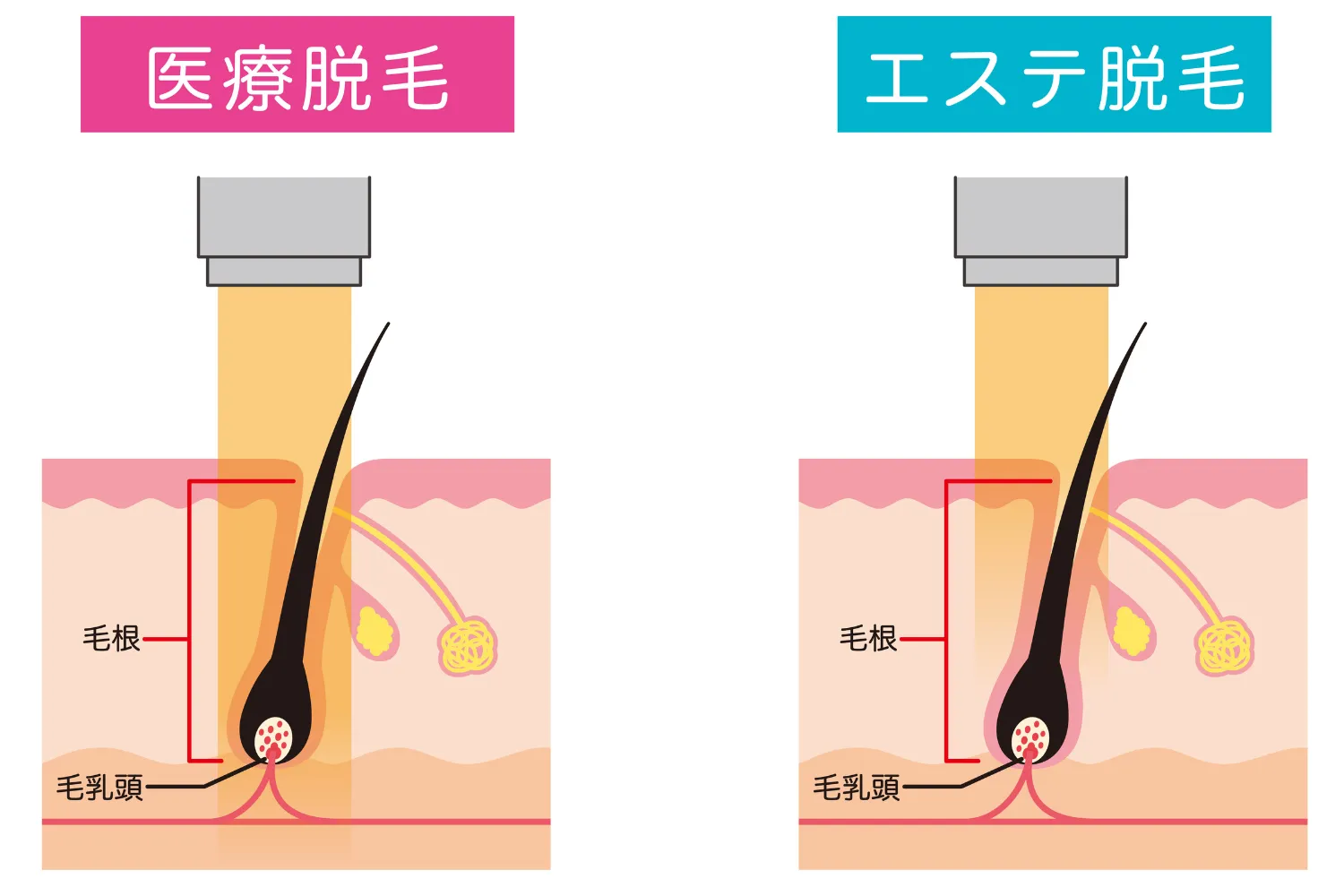 | 脱毛方法 | メラニン色素に反応して毛根組織を破壊して脱毛をする | 発毛の指令を出すバルジ領域にダメージを与えて脱毛をする | レーザーが肌の深くまで届き、毛根にダメージを与えて脱毛をする |